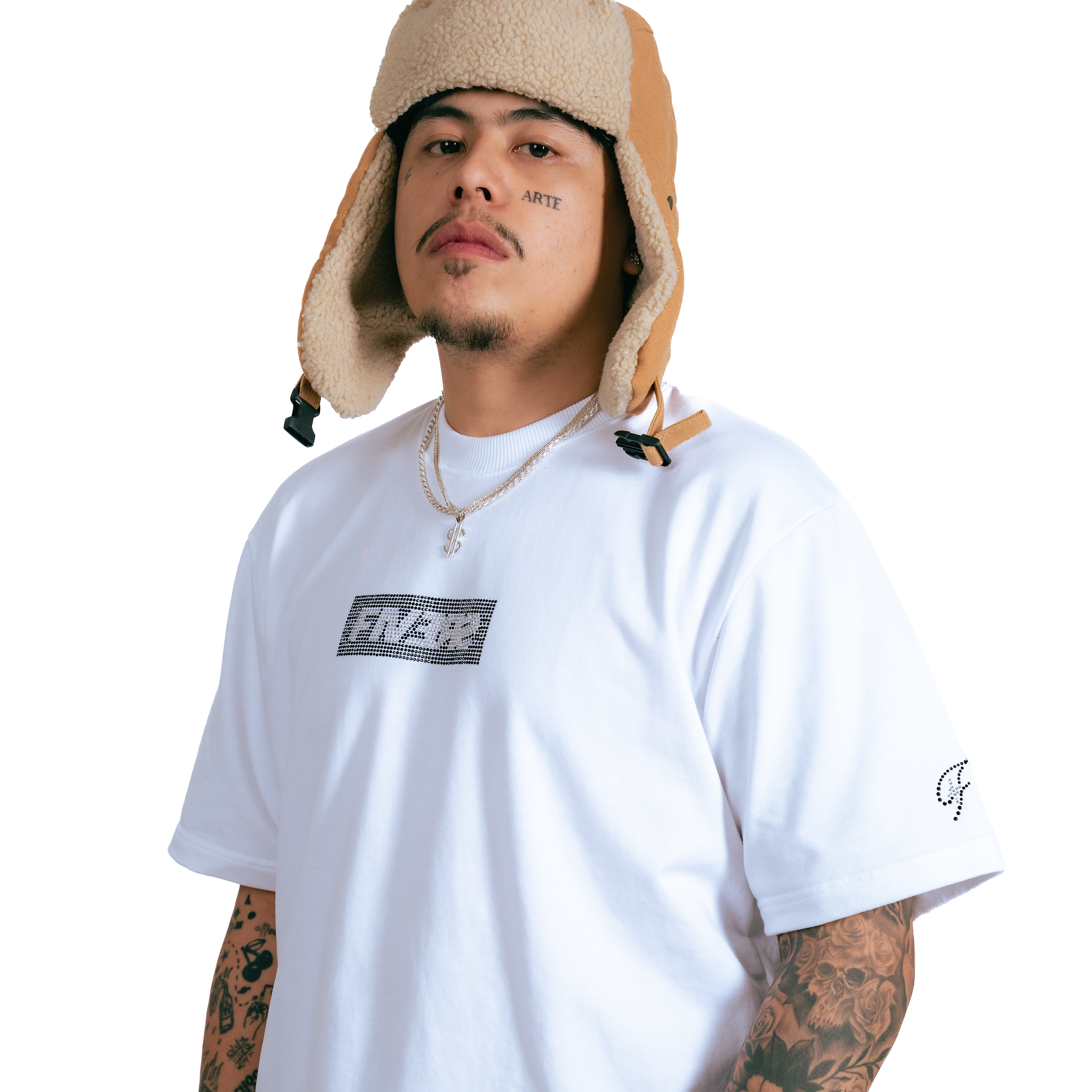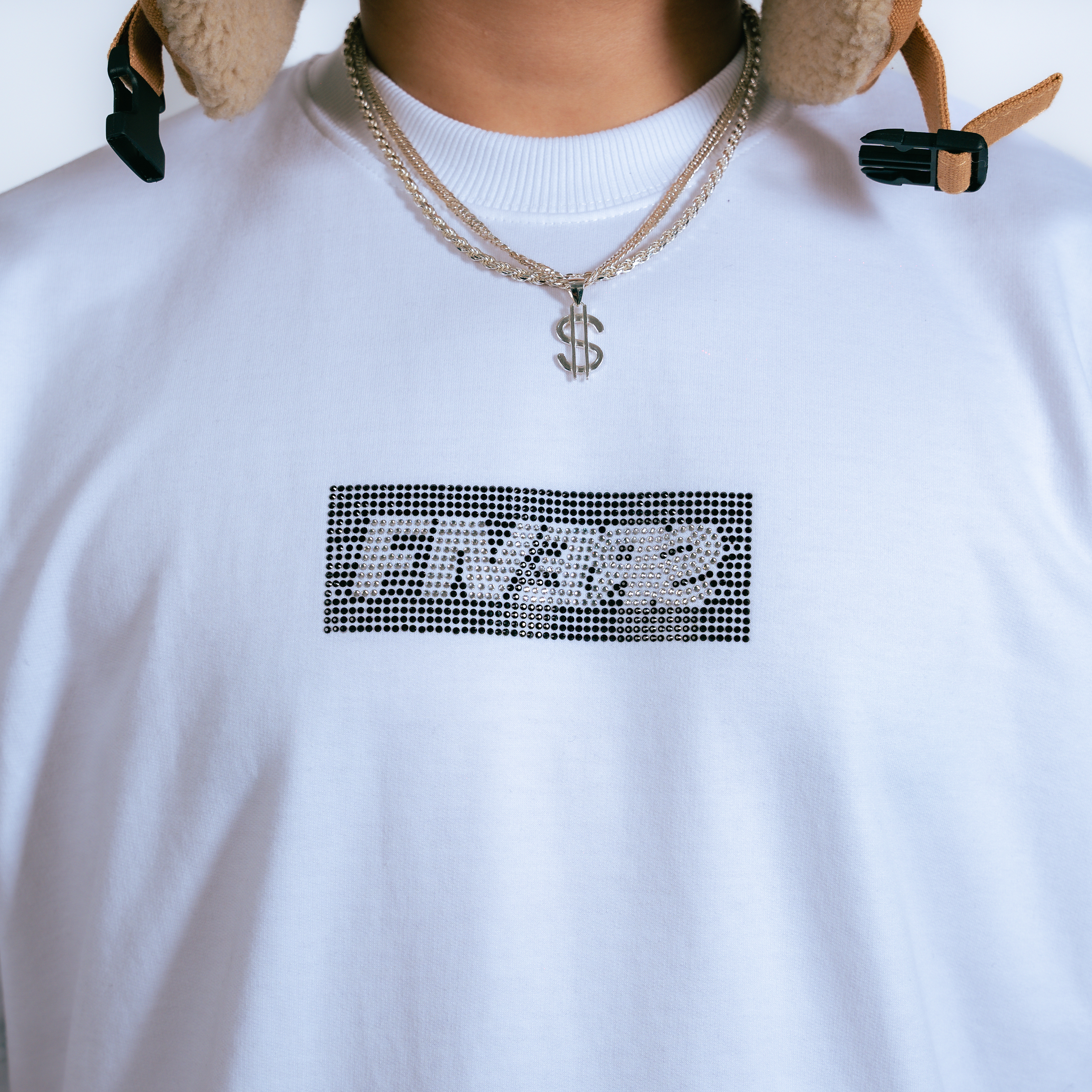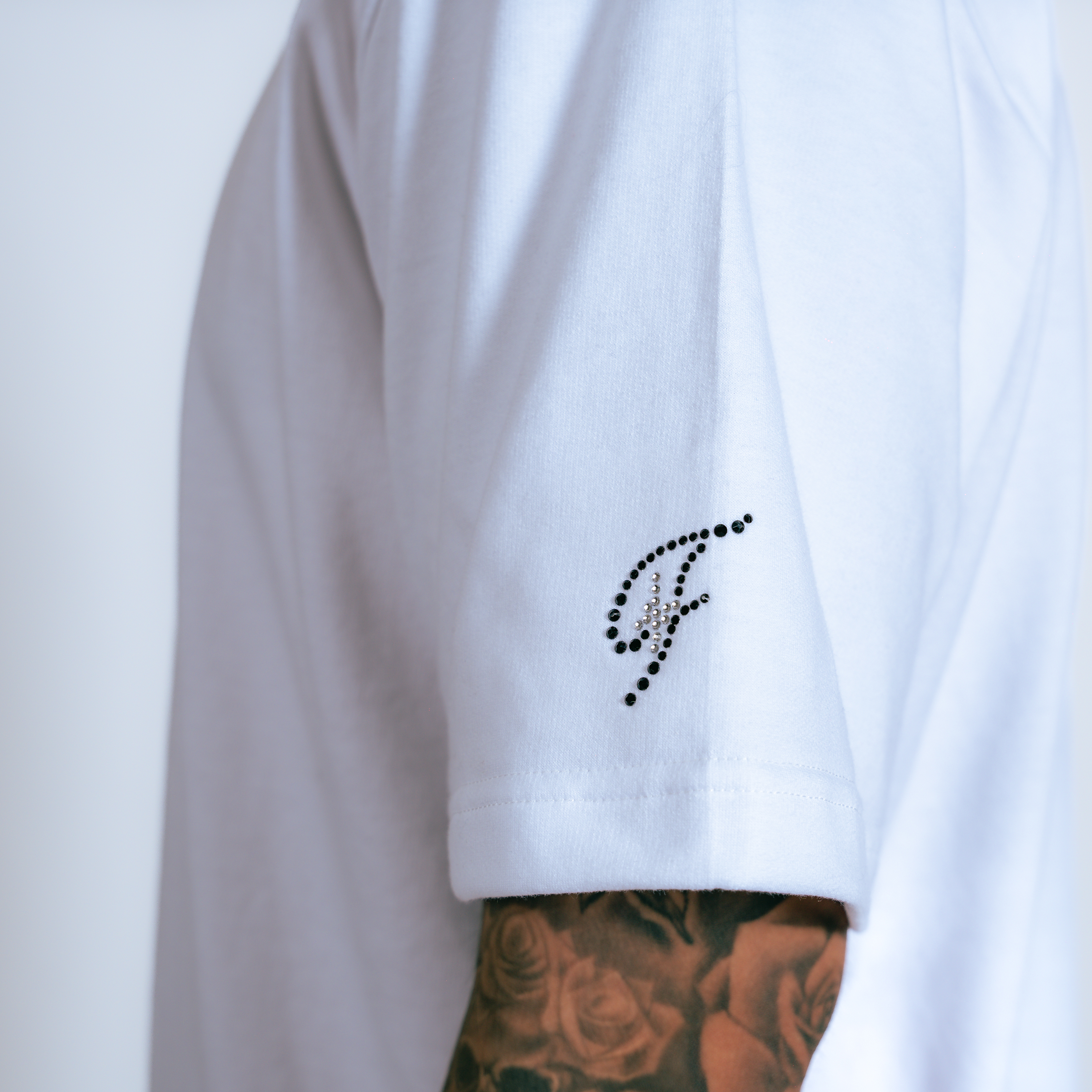 - Rhinestone Icon logo on sleeves